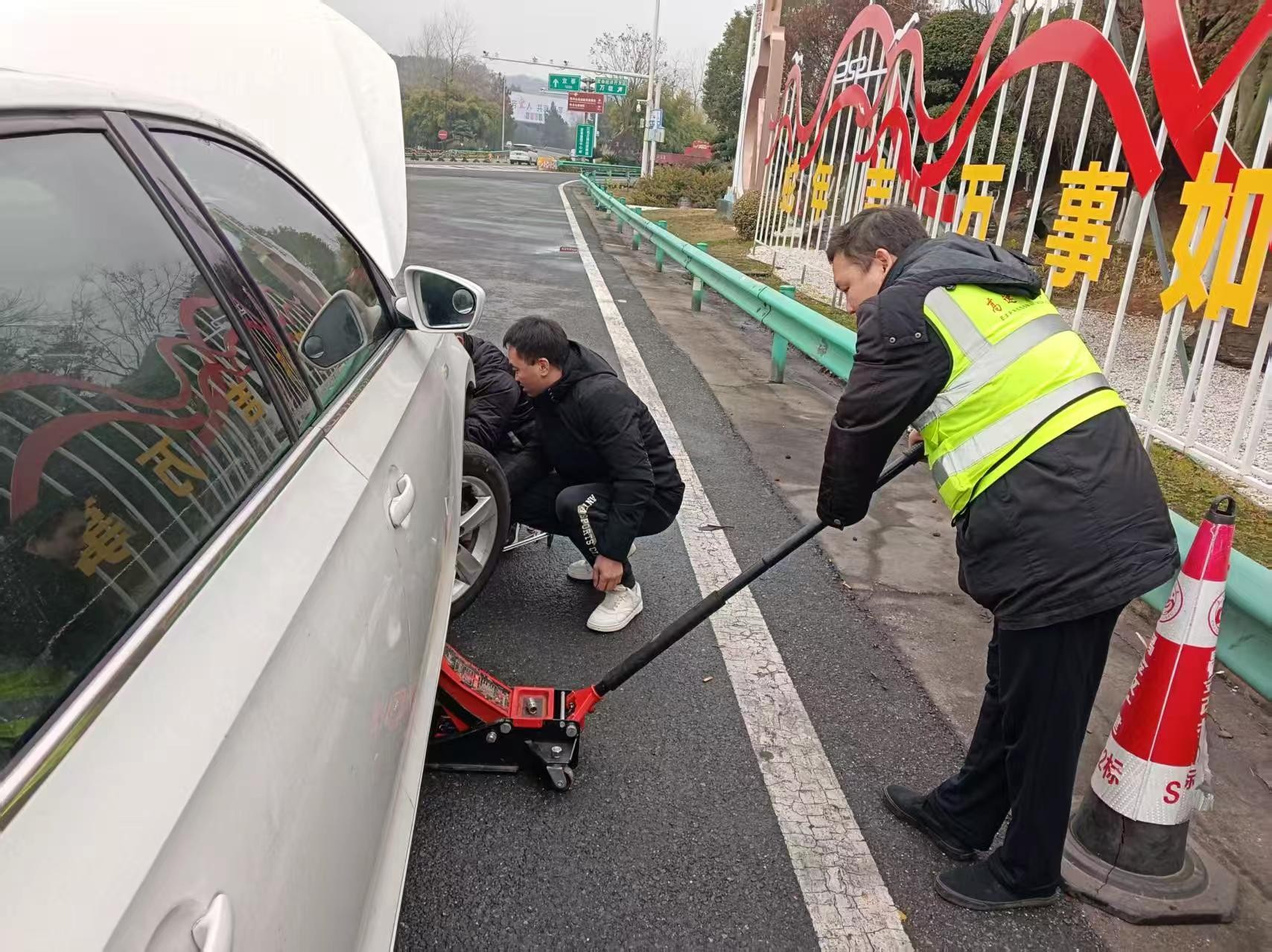 执勤工作人员发现后,主动上前询问,得知司机未带工具且不会换胎,立即从便民服务站取出千斤顶、备胎等工具,快速开展换胎工作。十几分钟后,车胎更换完毕,工作人员还检查了其他轮胎气压,叮嘱司机注意行车安全。司机对工作人员表示衷心感谢。