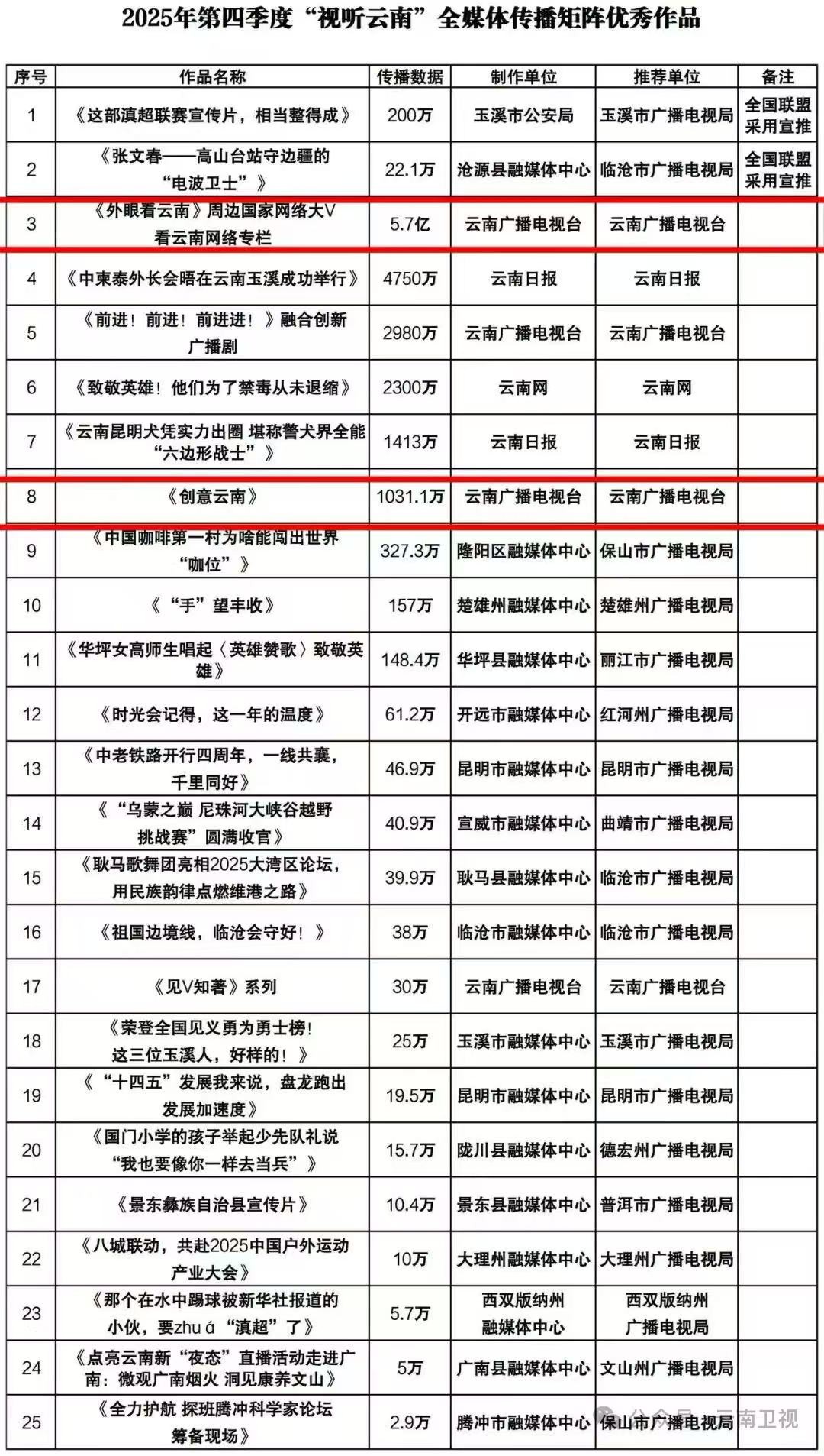 凤凰新闻网络电视台(记者司孟奇)近日,在云南省广电局2025年第四季度“视听云南”全媒体传播矩阵作品推优工作中,云南广播电视台对外传播中心打造的《外眼看云南-周边国家网络大V看云南网络专栏》与《创意云南》两档精品节目,从全省各单位推荐的109件作品中脱颖而出,成功入选25件季度优秀作品。这一成果,是云南广播电视台对外传播中心坚守主流价值、深耕创新表达的生动实践,更是其以融媒实干诠释媒体担当,为中国式现代化云南篇章注入主流媒体力量的有力彰显。