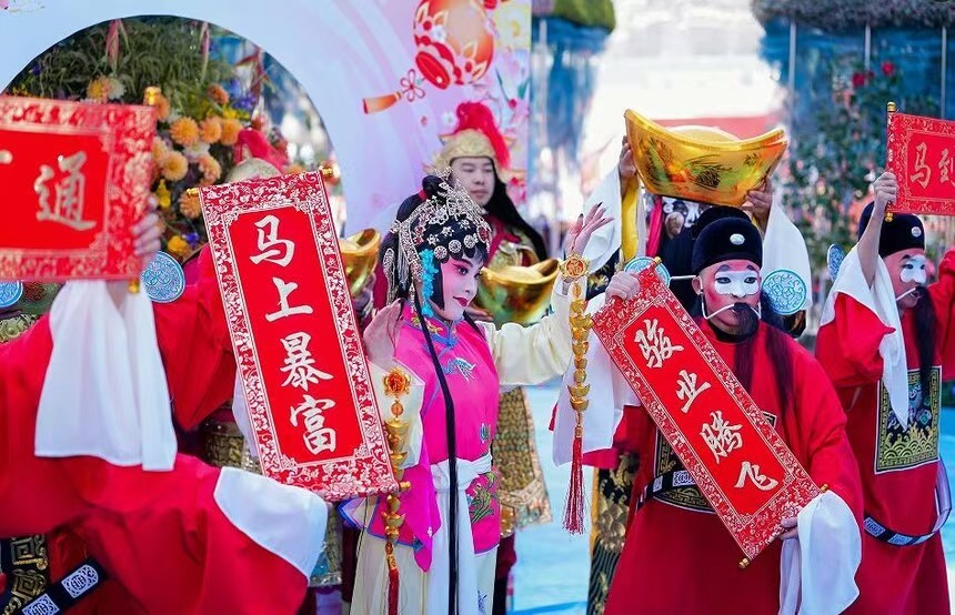 发布会现场,大型艺术沉浸式立体花雕“观山・观水・观春城”成为吸睛焦点,该花雕以高山杜鹃、云南山茶等50余种乡土花卉植物为主材,通过主题鲜明、造型新颖的艺术表达,生动诠释昆明生态宜居、开放包容的城市气质,成为新春城市景观的点睛之笔。此外,现场还精心筹备了诸多特色互动环节,氛围感拉满:汉服古风少年团为游客赠送新鲜花卉,传递新春祝福;《昆明蓝》歌曲演唱唱响春城的澄澈与浪漫;《四丑闹春・戏变乾坤》财神互动表演及财神巡游轮番上演,为现场游客送上新年福气,让整场发布会既有文化底蕴,又充满节日的热闹气息。