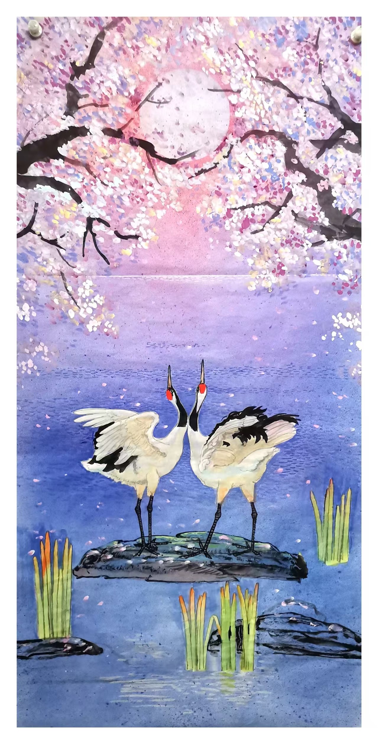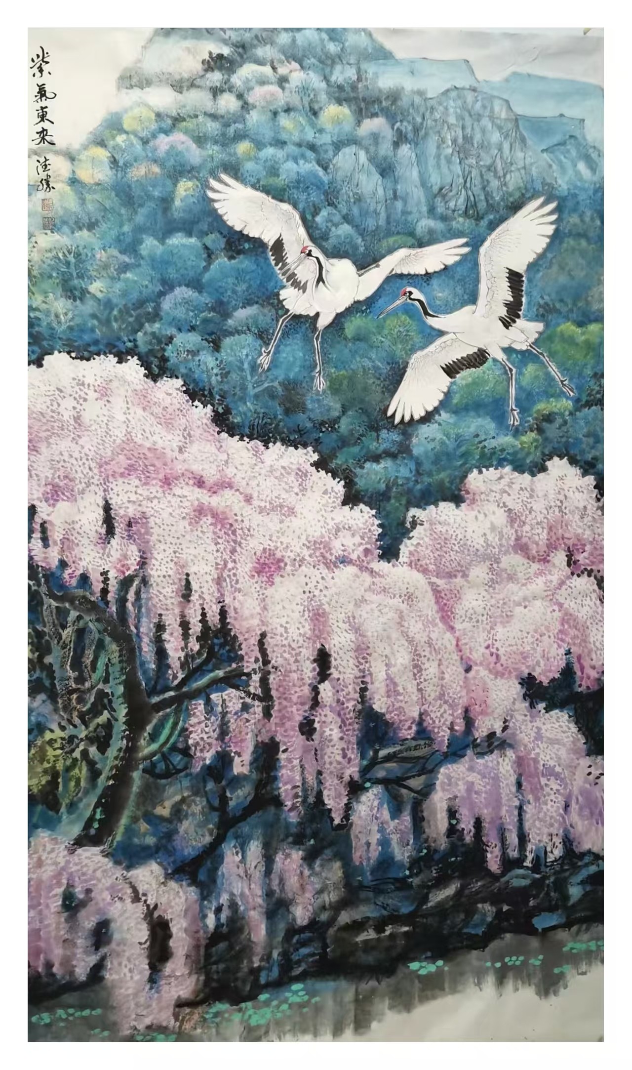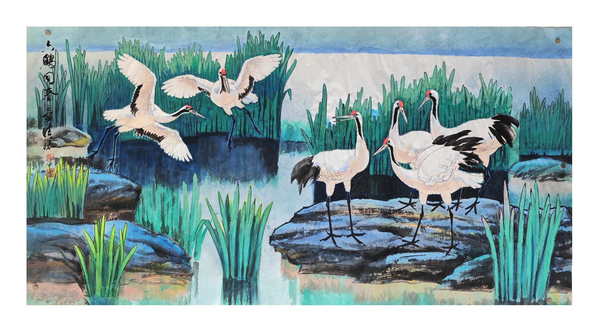 该作以宏大叙事与精湛技法走向国际。群鹤翱翔于高耸在祥云瑞气之间的华表周边,构图开阔舒展,色彩富丽典雅,鹤群的动态组织疏密有致、气脉贯通,既体现团结祥和的文化内涵,又展现东方艺术独有的韵律之美。画家以“整体气势撼人,局部细节精妙”的把控力,让作品兼具仪式感与艺术性,成为中外文化交流中极具代表性的精品力作。