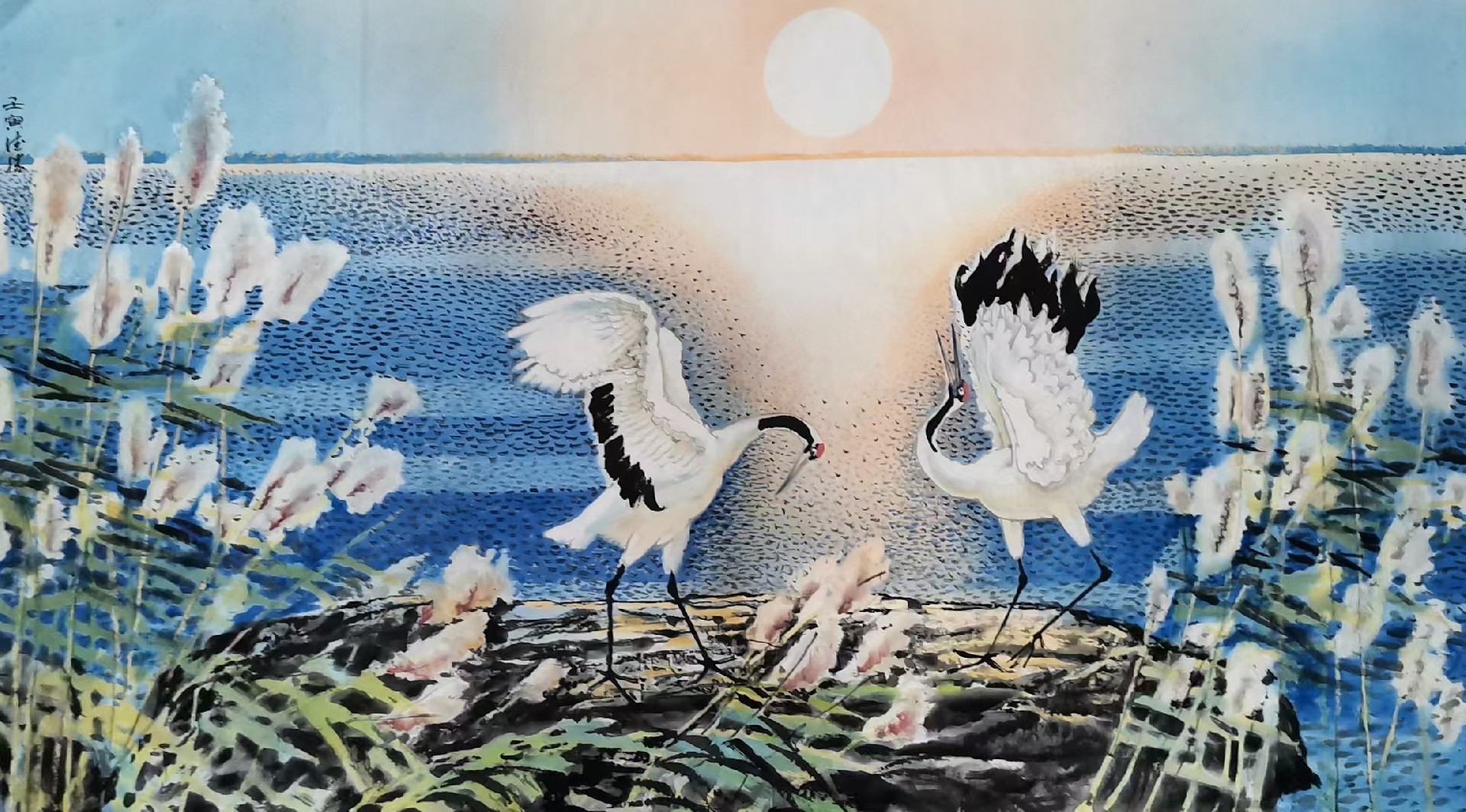 云鹤舞长空,重彩写乾坤。耄耋之年的纪德胜先生,依旧精力旺盛,体魄强健,每日快步十公里,步履稳健,神采奕奕。他热心群众文艺,积极参加各种活动,琴棋书画、诗词歌赋无不涉足,甚至还能与女青年在街头广场翩翩起舞,和着快三节拍旋转如飞,身姿轻盈、气度洒脱,观者无不赞叹。此情此景,让人自然想起他笔下的经典佳作《晨舞图》:两只仙鹤迎着霞光、舒展白羽、振翅高吟——画中鹤,正是人中仙;人中仙,化作画中鹤。先生以八秩高寿、一生痴情,写尽仙鹤之灵、之美、之骨、之神,不负丹青,不负初心,不负此生。其艺术实践与创作成果,必将在当代美术史上留下清晰而厚重的一笔。