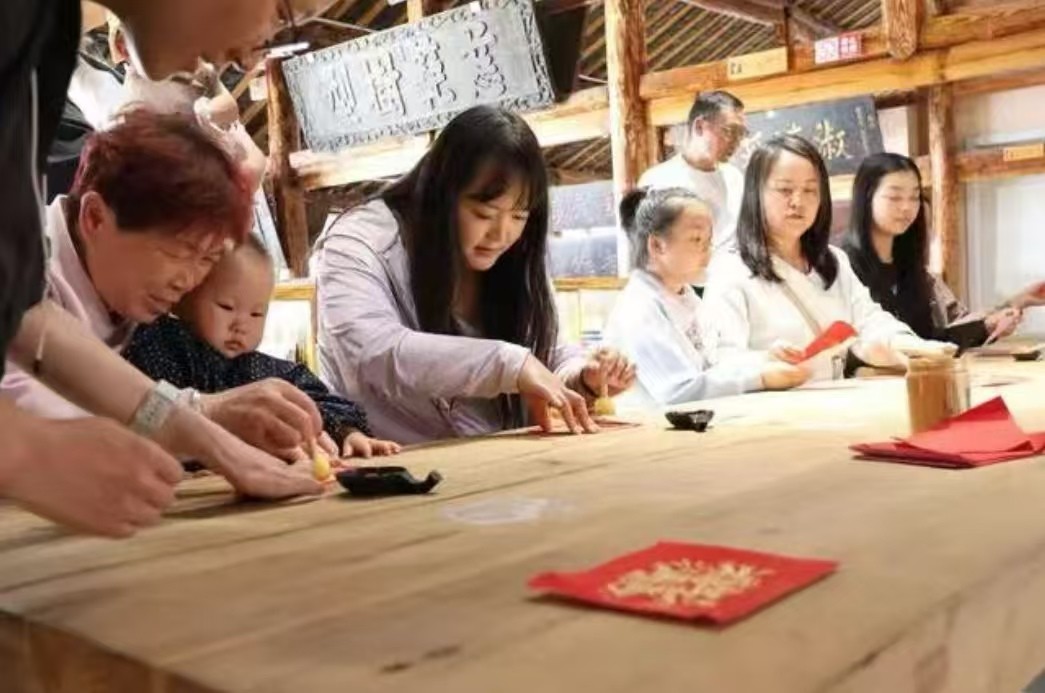 走出讲解区,拓印体验区里更是热闹非凡。现场工作人员为游客发放拓印工具包,志愿者手把手指导大家完成拓印操作,从铺纸、上墨到按压、揭纸,每一个步骤都细致讲解。亲子家庭搭档协作,非遗爱好者交流技巧,一张张吉祥图案在游客的手中慢慢成型,大家小心翼翼地将自己的拓印作品收好,这份亲手制作的非遗纪念品,成为此次红瓦房旅居之行的独特收获。