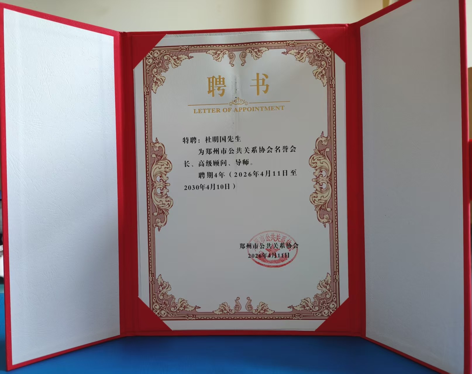【凤凰新闻网络电视台】记者秦焕民 常向珍 朱玉超报道:在郑州市公共关系协会 2026 年第四次理事会议上,我国第一代公共关系专家、知名公关学者杜明国教授正式获聘郑州市公共关系协会名誉会长、高级顾问、导师。此举旨在凝聚资深专家智慧,强化协会专业智库支撑,为郑州市公共关系事业高质量发展注入强劲学术动能与实践引领力。