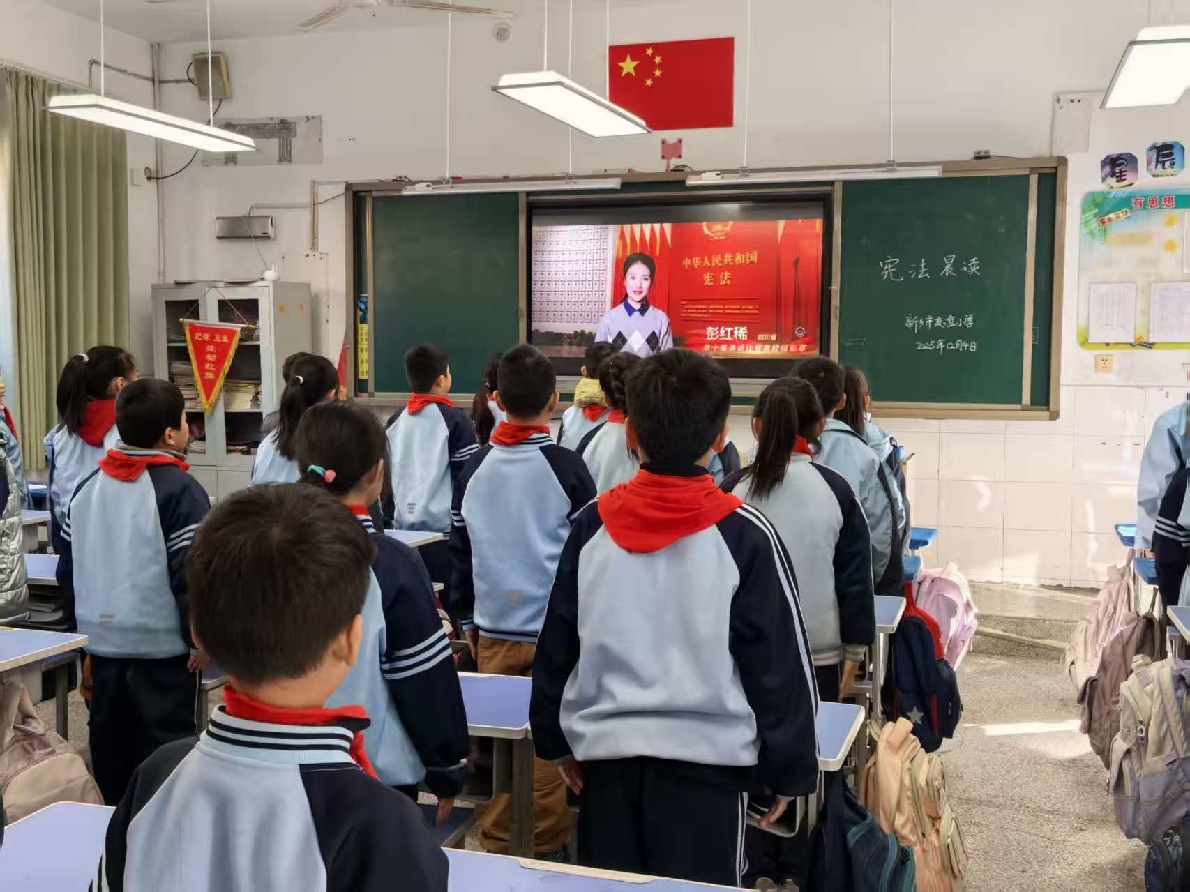 宪法日当天,各班开启了宪法晨读活动。教室里,通过观看直播,让学生们直观地接触到宪法知识,更让他们在宪法诵读中感受到宪法的庄严与神圣。直播结束后,老师们结合学生的年龄特点,用通俗易懂的语言讲解宪法的基本原则和核心内容,将抽象的法律概念转化为贴近生活的案例,帮助同学们理解宪法如何保护公民的权利,引导他们树立 “学法、知法、懂法、守法” 的意识。