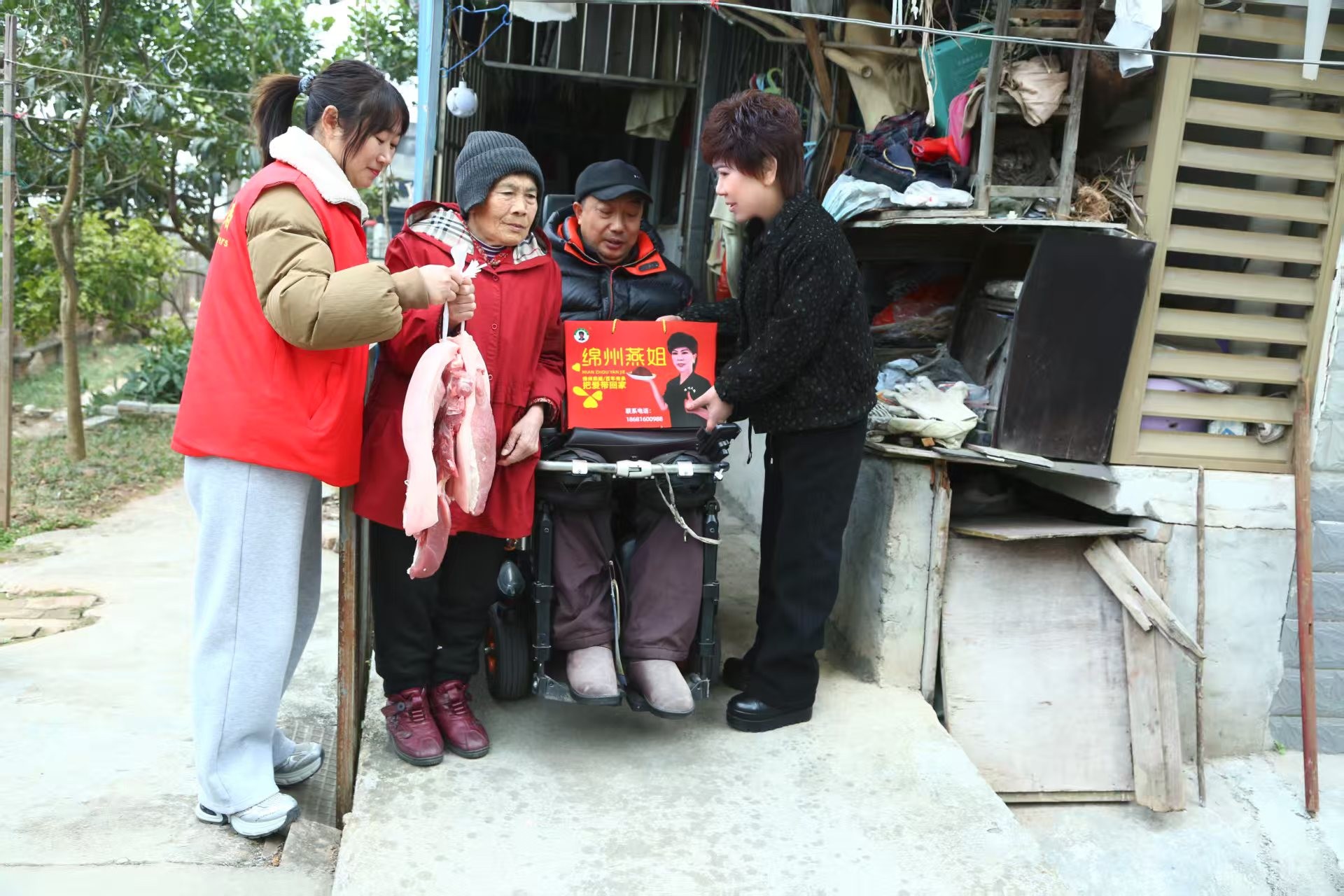 随后绵州燕姐又来到游仙区,由汉仙桥社区党委书记书记王兴关安排下,社区主任朱小槐陪同燕姐慰问社区农民工和困难残疾人,绵州燕姐为他们送上礼品盒,水果,香肠和新鲜猪肉。绵州燕姐又专门派车为安州区残疾人梁明洪送去了新鲜猪肉。游仙区的农民工把自己种的青菜送给燕姐以表谢意。