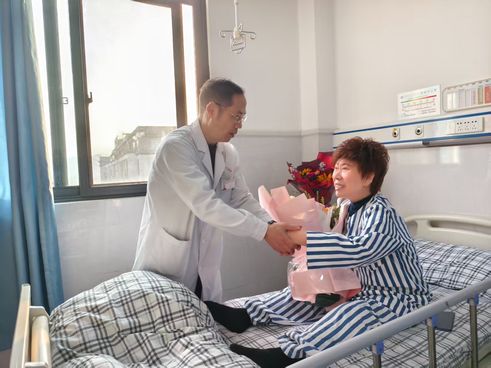住院期间,院长孙军曾专程前往病房看望燕姐,关切询问其病情与治疗情况,这份暖心关怀让燕姐倍感温暖。出院之际,心怀感恩的燕姐特意为内四科医护人员送上锦旗,向全体医护人员表达最诚挚的谢意。