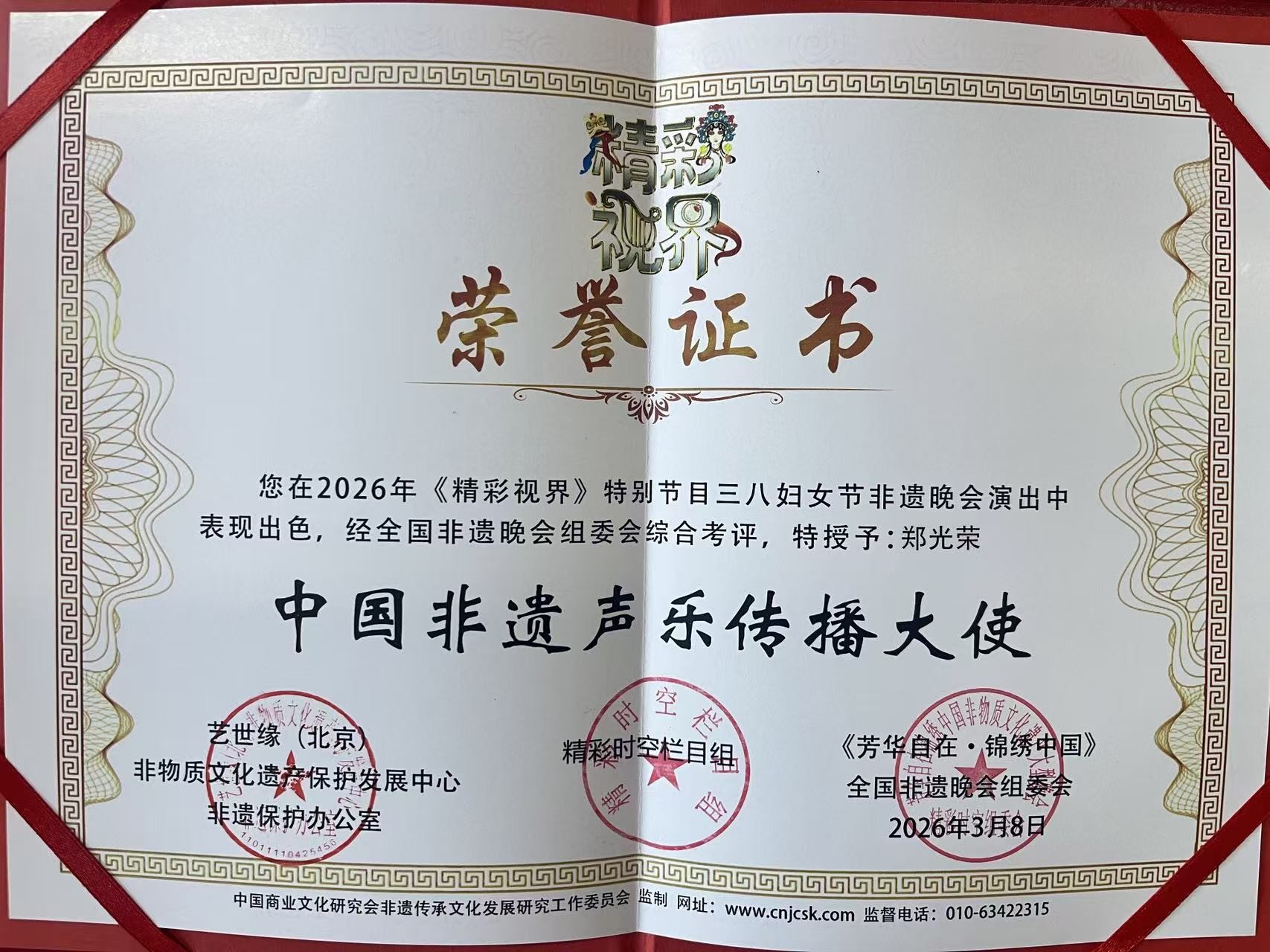 此次获评“中国非遗声乐传播大使”,是对其艺术造诣与文化贡献的高度肯定。未来,郑光荣将继续以声为媒、以艺传情,坚守传承初心,创新表达形式,让非遗吆喝走进更多人心中,让古老传统技艺在新时代持续焕发新生。